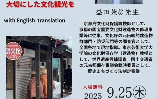 講演会「城下町雁木町並と寺町を大切にした文化観光を」 9月25日(木)午後5時から高田小町での講演会の案内をいただきました。聴講には予約不要とのことですが、先着順ですので興味のある方は早めにお出かけください。